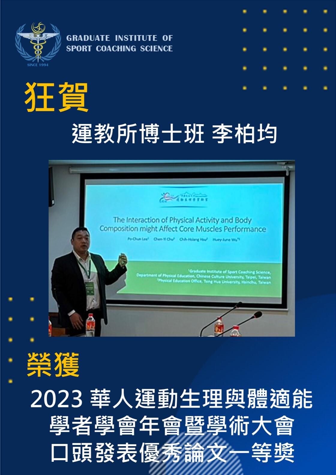 2023-10-16 狂賀 ! 運教所博士班李柏均榮獲 2023 華人運動生理與體適能學者學會年會暨學術大會口頭發表優秀論文一等奬
