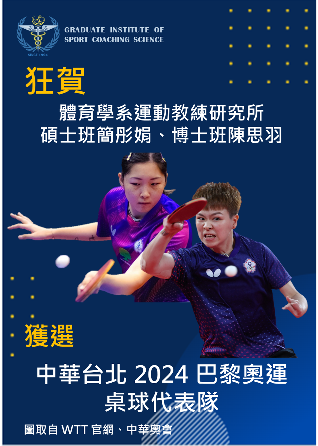 2024-06-14 狂賀 ! 運動教練研究所博士班陳思羽、碩士班簡彤娟入選中華台北 2024 巴黎奧運桌球代表隊